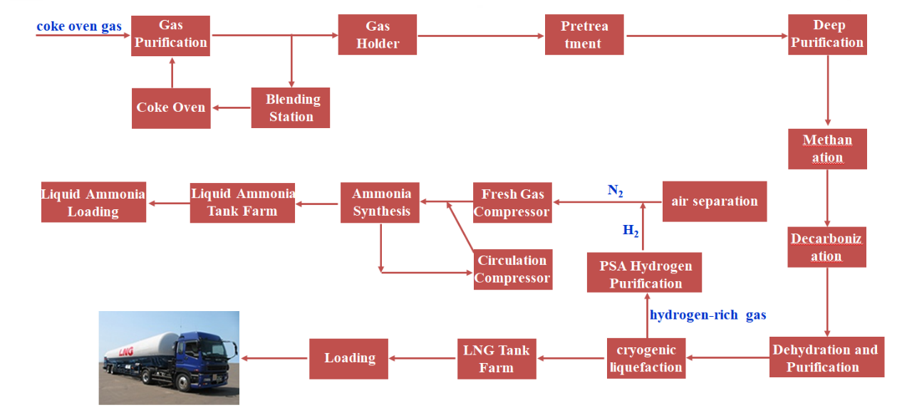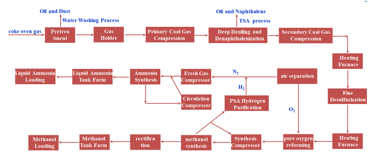 Coke oven gas (COG), an important by-product of in coking process, contains valuable components such as hydrogen and carbon monoxide. It serves as a feedstock for producing methanol, LNG, and synthetic ammonia. Refining of COG is crucial for enhancing the overall economic performance of coking plants. ACRE has mastered a range of technologies, including methanol synthesis, liquid ammonia production, and LNG manufacturing.