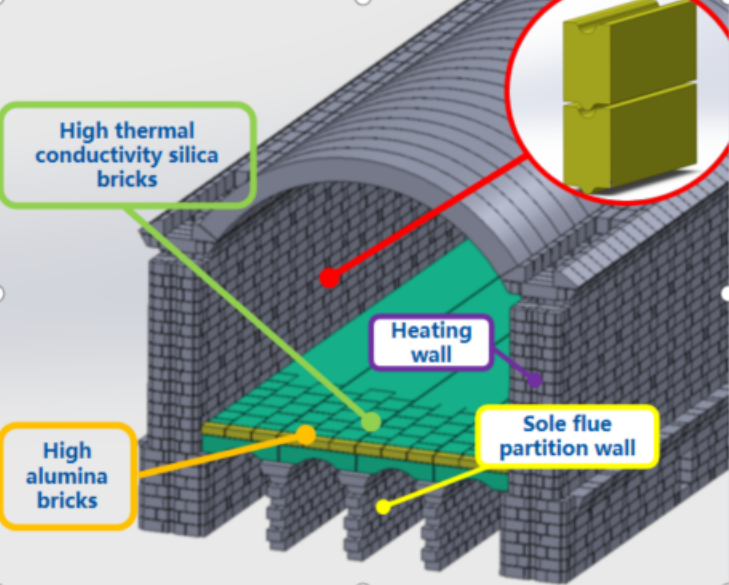 The coking chamber is paved with high thermal conductivity silica bricks for better heat transfer and higher wear resistance. The coking chamber has double-layer structure at oven ends, with an outer layer of high alumina bricks with good thermal shock resistance and corrosion resistance so as to reduce erosion and wear of the oven ends. The heating wall and sole flue partition wall bricks are provided with tongue-groove locks for higher strength of the entire refractory block.