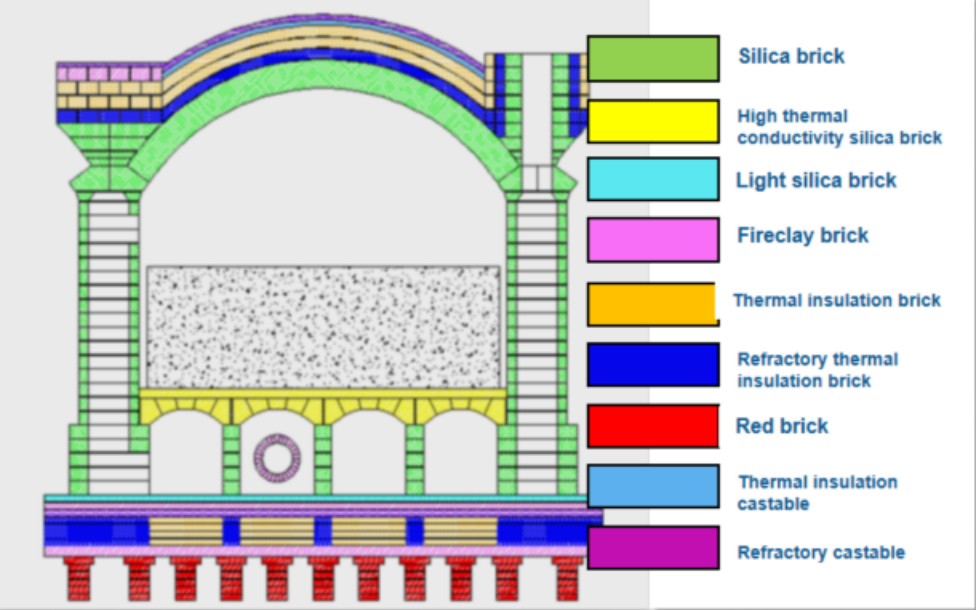 The oven bottom is of composite refractory structure, consisting of silica insulation brick, fireclay brick, floating particle brick, thermal insulation brick and red brick. The oven roof is of composite refractory structure, consisting of silica brick, refractory fiber, floating particle brick, thermal insulation brick and castables. With insulation measures, the energy density of flue gas increases by 10%, the average surface temperature of HRO decreases by 25℃. The overall investment in refractory reduces by about 5%, and the service life of the HRO is significantly extended.