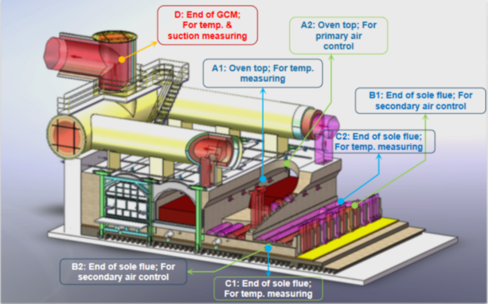 Temperature-based control mode: Position D: Measurement of suction at the end of GCM, as a guide to control the speed of flue gas fan; Position A1: Measurement of oven arch space temp., to be interlocked with primary air regulating device located at position A2 for temp. control; Position B1: Measurement of temp. at the end of sole flue, to be interlocked with secondary air regulating device located at position B2 for temp. control; Position C1: Measurement of temp. at the end of sole flue, to be interlocked with secondary air regulating device located at position C2 for temp. control.