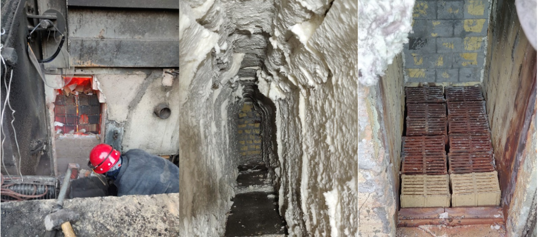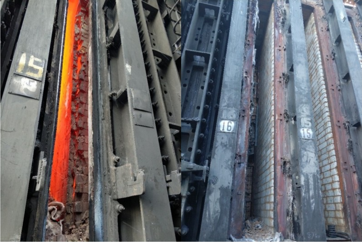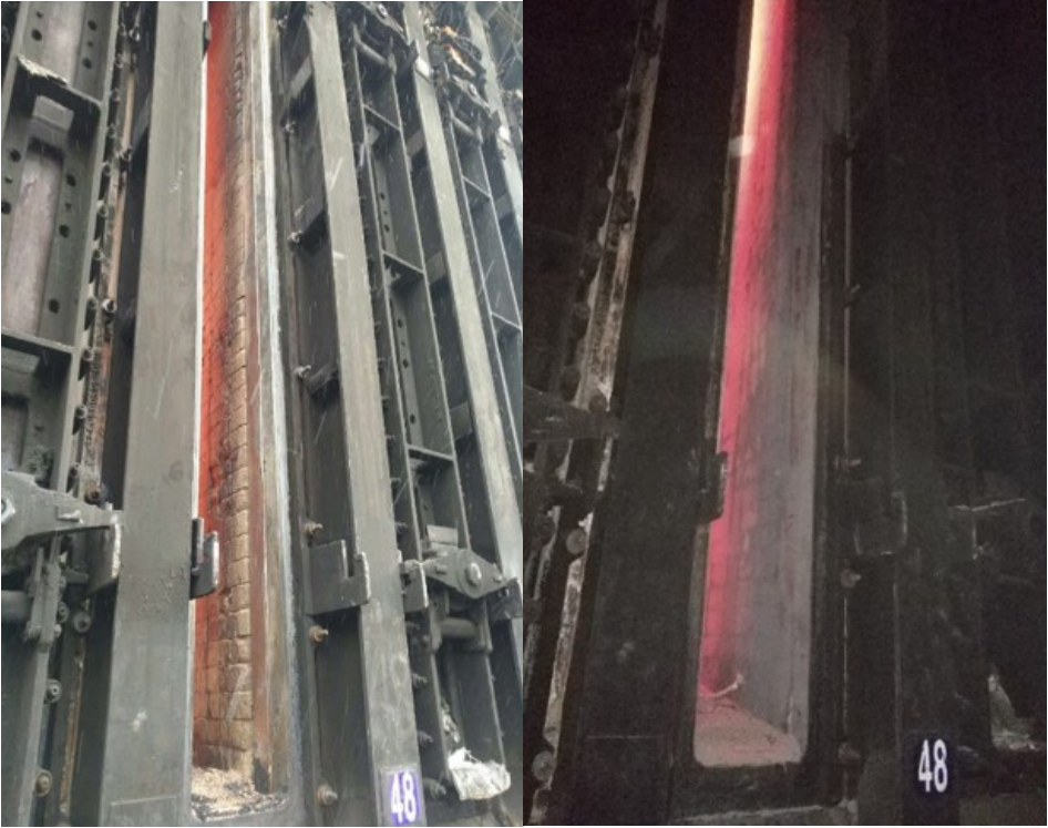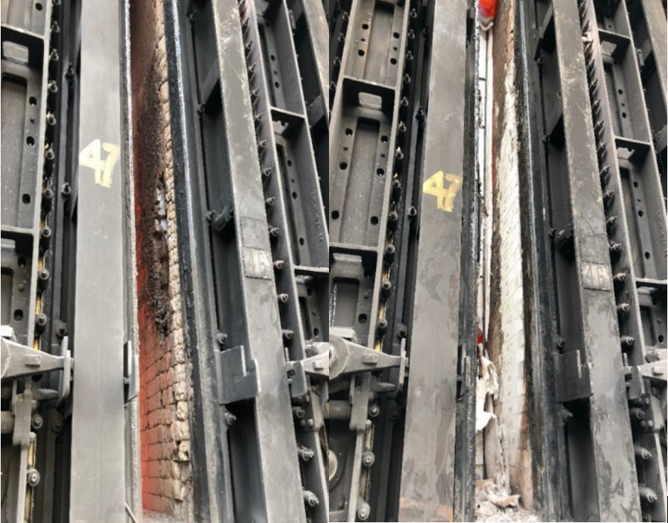 Problems of corbel zone ports being melted and blocked affects the normal airflow in heating flues and causes abnormal oven temperature, and further affect production. It’s a common problem encountered in production. According to ACRE’s reference projects, corbel zone ports were dredged for batteries in many coking plants, including dredging of corbel zone port in intermediate of battery. During maintenance, remaining heating flue temperature for repaired heating wall will be above 850 ℃ except for the construction area, providing maximum protection for the un-repaired battery walls.